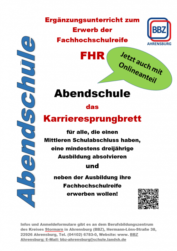 Du hast einen Mittleren Schulabschluss, befindest dich in einer mindestens dreijährigen Ausbildung – und willst nebenbei deine Fachhochschulreife (FHR) erlangen? Dann bist du beim Berufsbildungszentrum Ahrensburg genau richtig!