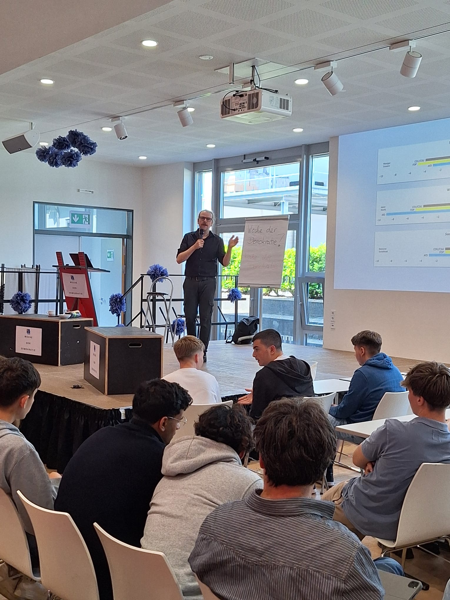 Zu Beginn der Woche referierte Sebastian Friedrich in der Aula mit seinem Vortrag „Das Erstarken von rechtsradikalen Parteien“ vor 200 Schülerinnen und Schülerin über die Errungenschaft von Demokratie in Deutschland, Europa und der globalen Welt. Immer wieder warnte er davor, was passieren kann, wenn wir das Gut der Demokratie aufs Spiel setzen. „Schützen sie die Demokratie, indem sie sich für sie einsetzen und, auch wenn es anstrengend ist, in Institutionen, Ehrenämtern oder sich sogar auch selbst politisch daran beteiligen.“ Es war ein fordernder Vortrag, in dem Friedrich die jungen Menschen mit in die gesellschafts-politische Tiefe mitnahm und in einer intensiven Auseinandersetzung die Gefahren von rechtsextremen Parteien für die Demokratie darstellte.