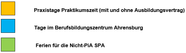 Der Ausbildungsbeginn der SPA 2025 startet mit der Einschulung am Dienstag, 09.09.2025, um 8 Uhr in der Aula des Berufsbildungszentrums in Ahrensburg. Alle Ausbildungspartnerinnen und -partner sind herzlich dazu eingeladen. In der gesamten ersten Woche (37. KW) sind die SuS im Berufsbildungszentrum. Ab der 38 KW, ab Montag, 15.09.2025 beginnen die Praxistage in den Einrichtungen, mit denen die SPAs kooperieren und werden offiziell in der Woche des letzten Praktikumsblocks, Freitag, 05.06.2026 beendet.