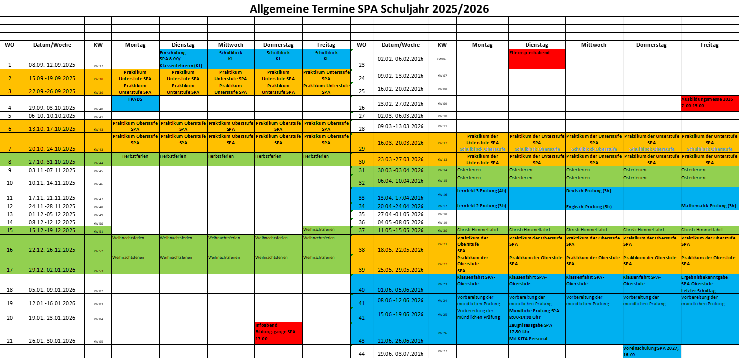 Der Ausbildungsbeginn der SPA 2025 startet mit der Einschulung am Dienstag, 09.09.2025, um 8 Uhr in der Aula des Berufsbildungszentrums in Ahrensburg. Alle Ausbildungspartnerinnen und -partner sind herzlich dazu eingeladen. In der gesamten ersten Woche (37. KW) sind die SuS im Berufsbildungszentrum. Ab der 38 KW, ab Montag, 15.09.2025 beginnen die Praxistage in den Einrichtungen, mit denen die SPAs kooperieren und werden offiziell in der Woche des letzten Praktikumsblocks, Freitag, 05.06.2026 beendet.