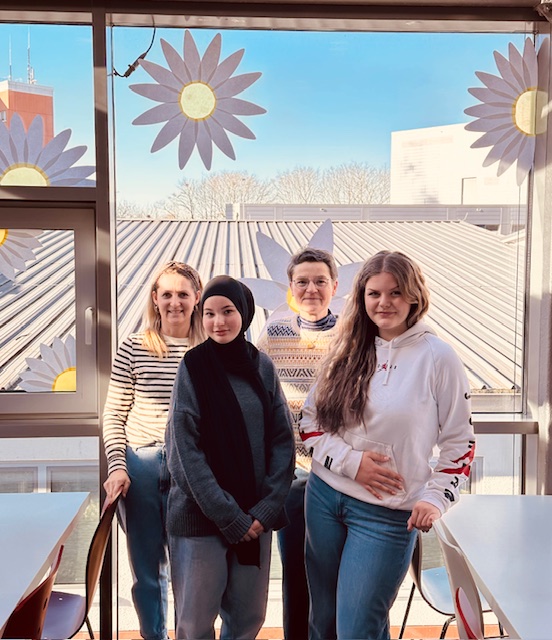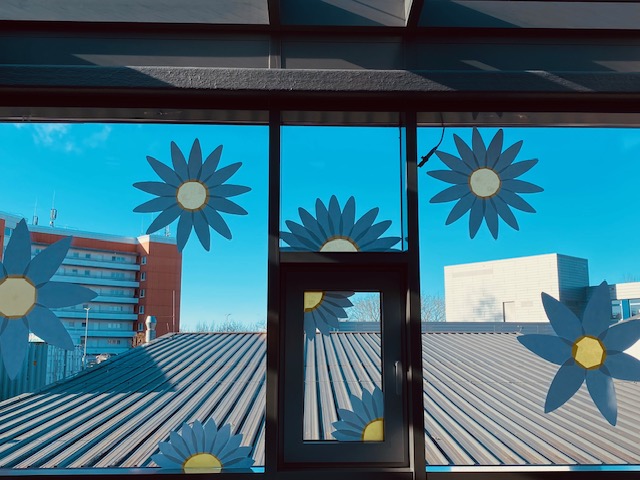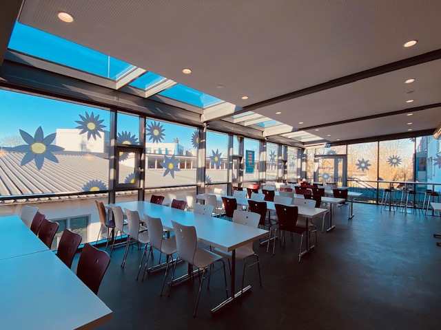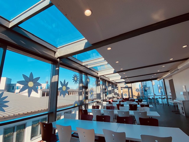 Mit einer kreativen Idee und tollem Engagement hat die AvH die Mensa frühlingshaft gestaltet. Große, selbstgebastelte Blüten in frischem gelb-weisse schmücken nun die Fensterfront und lassen den Raum heller und freundlicher wirken. Das neue Design bringt Frühlingsstimmung ins Schulgebäude und macht die Mensa zu einem noch angenehmeren Ort für die Pausen und das gemeinsame Essen.