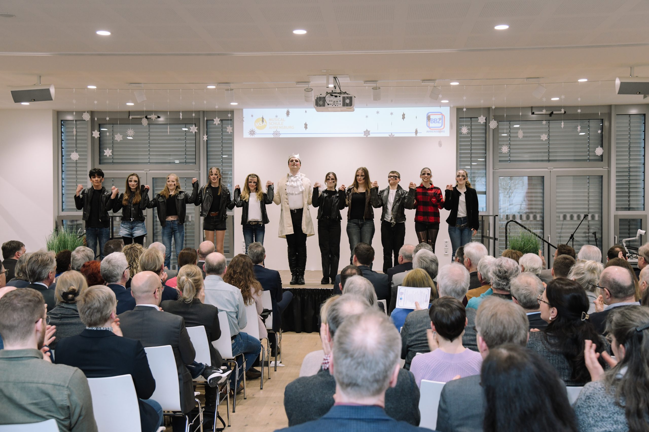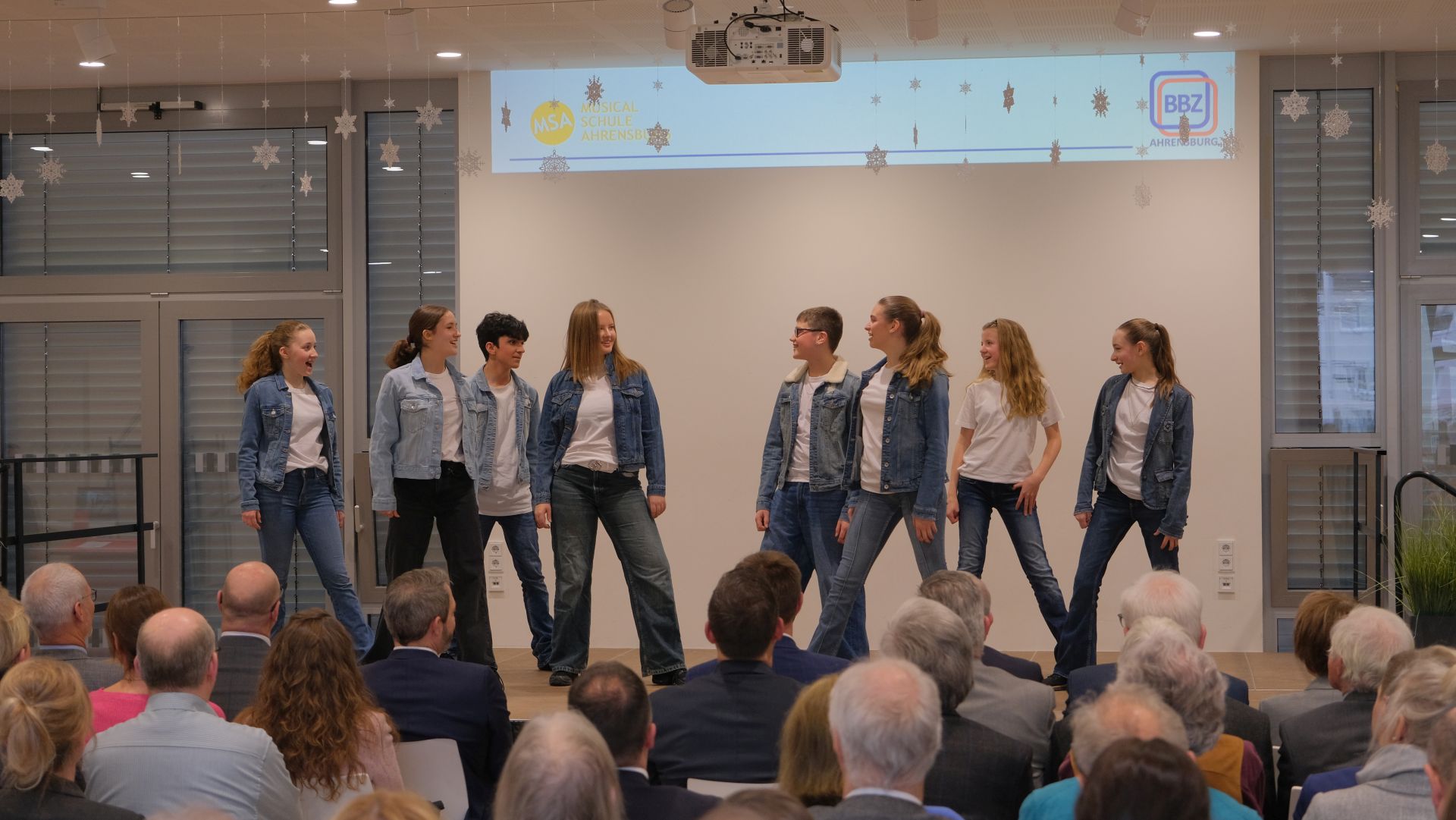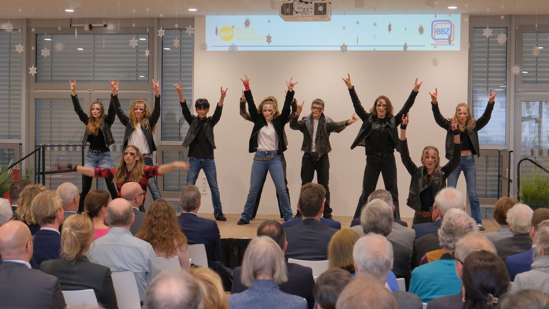 Ein erster Höhepunkt der Veranstaltung war ein filmischer Beitrag über unsere Schule in der Vergangenheit und im Hier und Jetzt. Professionell gedreht von unserem Kollegen Dirk Baasch. Mitwirkende waren unsere ehemaligen Kollegen Matthias Puck und Dr. Norbert Weppelmann, die in dem Film in Höchstform aufliefen und über die historische und bauliche Entwicklung unserer Schule diskutierten. Ein weiterer Höhepunkt des Festakts waren die Darbietungen der Jugendlichen der Ahrensburger Musicalschule, die das Publikum mit tänzerischen Einlagen und bekannten Songs aus Rock, Pop und Musicals in Stimmung und zum Staunen brachten. Herzlichen Dank an die Verantwortlichen der Höhepunkte!