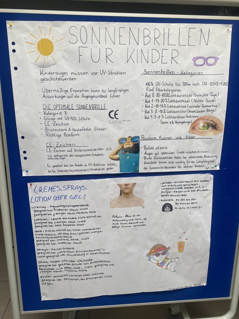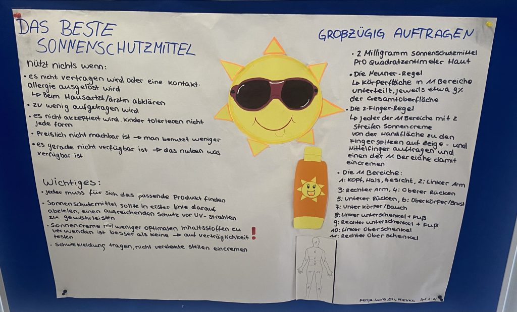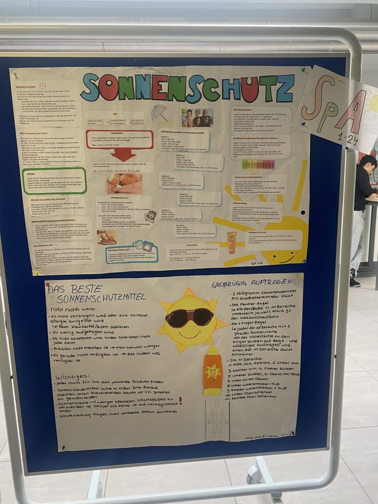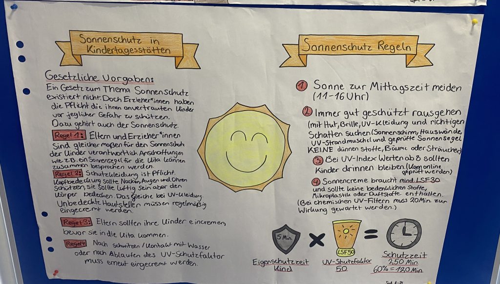 Die entstandenen Plakate liefern auch über die SPA-Ausbildung hinaus für alle Schülerinnen und Schüler relevante Informationen. Denn UV-Schutz ist kein reines Kita-Thema. Er betrifft uns alle: als junge Erwachsene, als Eltern, Geschwister oder Freunde!