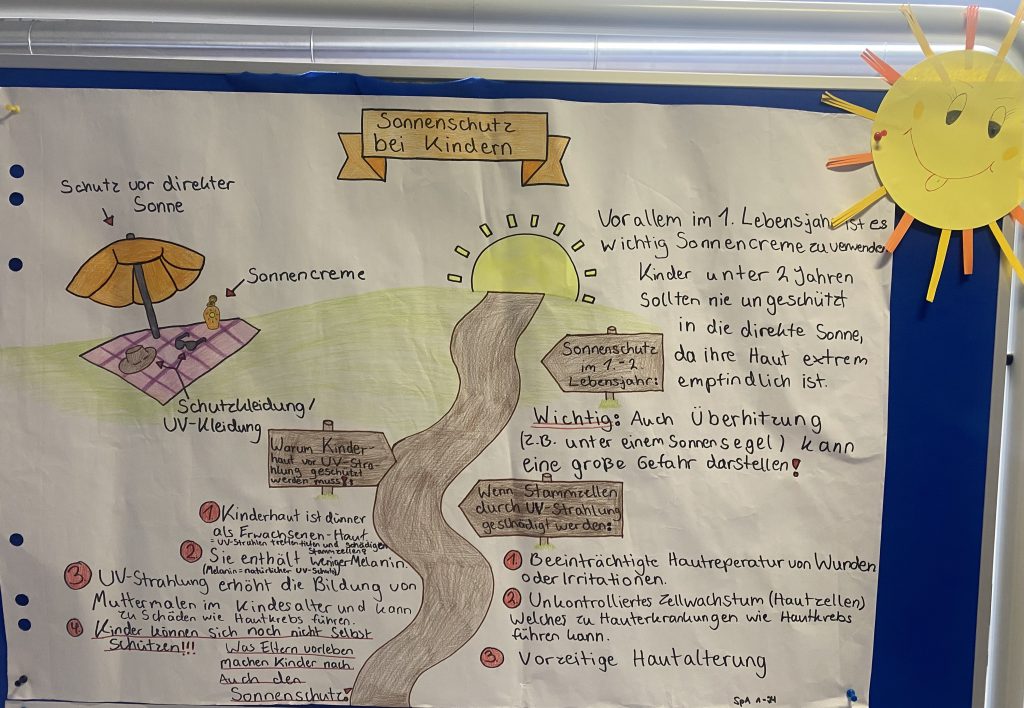 Pünktlich zu den ersten heißen Tagen des Jahres hat sich die Klasse SPA 1-24 im Rahmen des ÖKG-Gesundheitsunterrichts bei Frau Emmerlich intensiv mit dem Thema Sonnenschutz und UV-Strahlung beschäftigt.