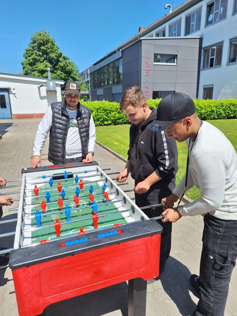 Der Kickertisch war das kompliziertere Spielgerät, zumindest was den Aufbau betraf. Doch eine Klasse aus dem Fachbereich Möbel-, Küchen- und Umzugsservice, „echte Macher“, nahmen sich die Aufbauanleitung zur Hand und setzten das Projekt an einem Vormittag um. Nach dem Zusammenbau wurde natürlich noch ein klasseninternes Kickerturnier gespielt. „Der Kickertisch ist auf jeden Fall bespielbar“, so einer der Schüler, nachdem er das Turnier gewonnen hatte.
