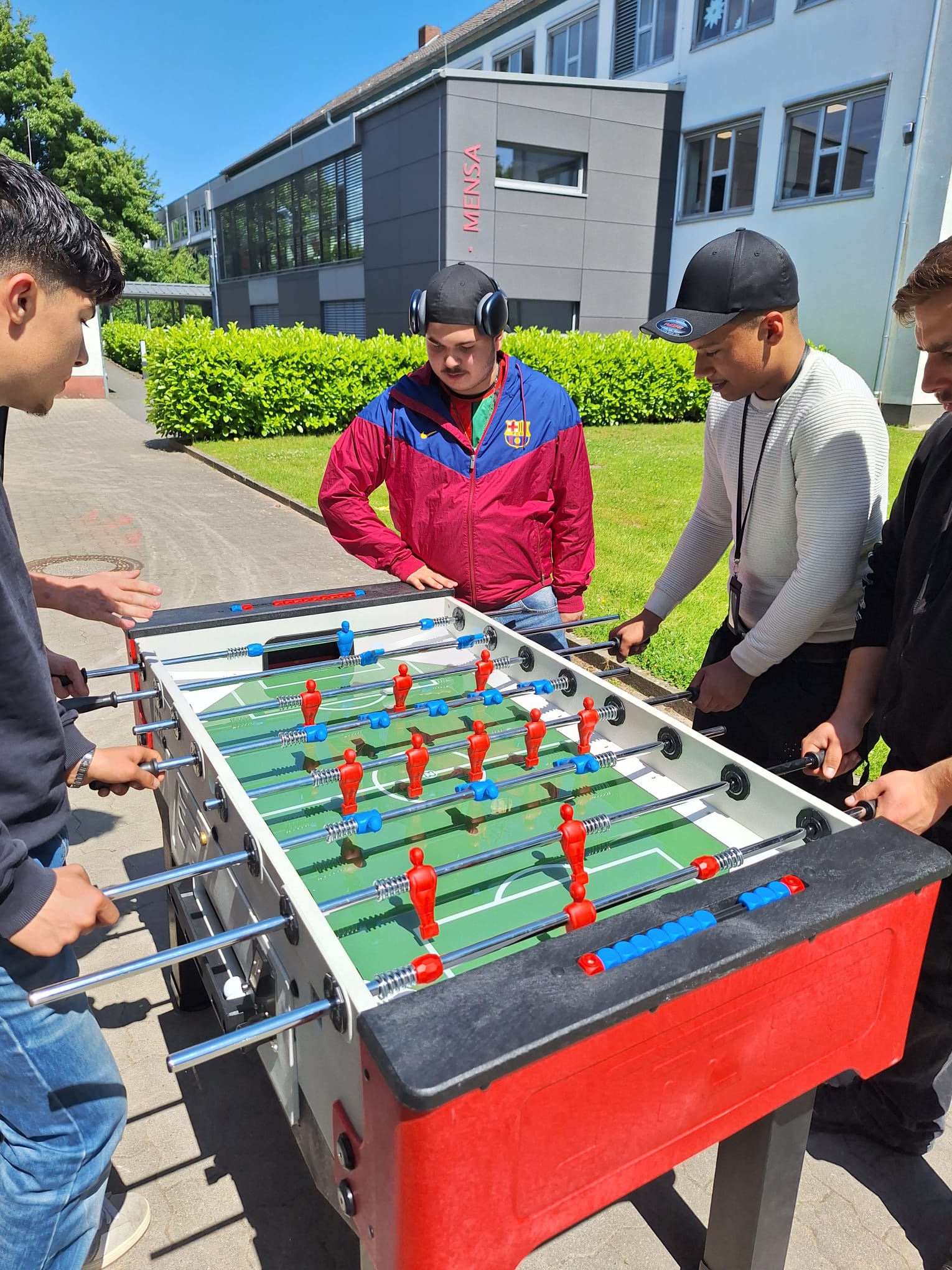 In einer Abfrage der Beruflichen Schule Ahrensburg kam heraus, dass sich die Schüler/-innen mehr Sportgeräte für die Gestaltung der Pause wünschen. Neben einer Tischtennisplatte ging es auch um einen Kickertisch. Die Tischtennisplatte steht bereits an der Logistikhalle und kann bespielt werden. Die jungen Erwachsenen bringen ihre Schläger und Bälle mit und los geht’s. Für die Tage an denen die Schläger vergessen worden sind, soll es in Zukunft Möglichkeiten zum Ausleihen geben.