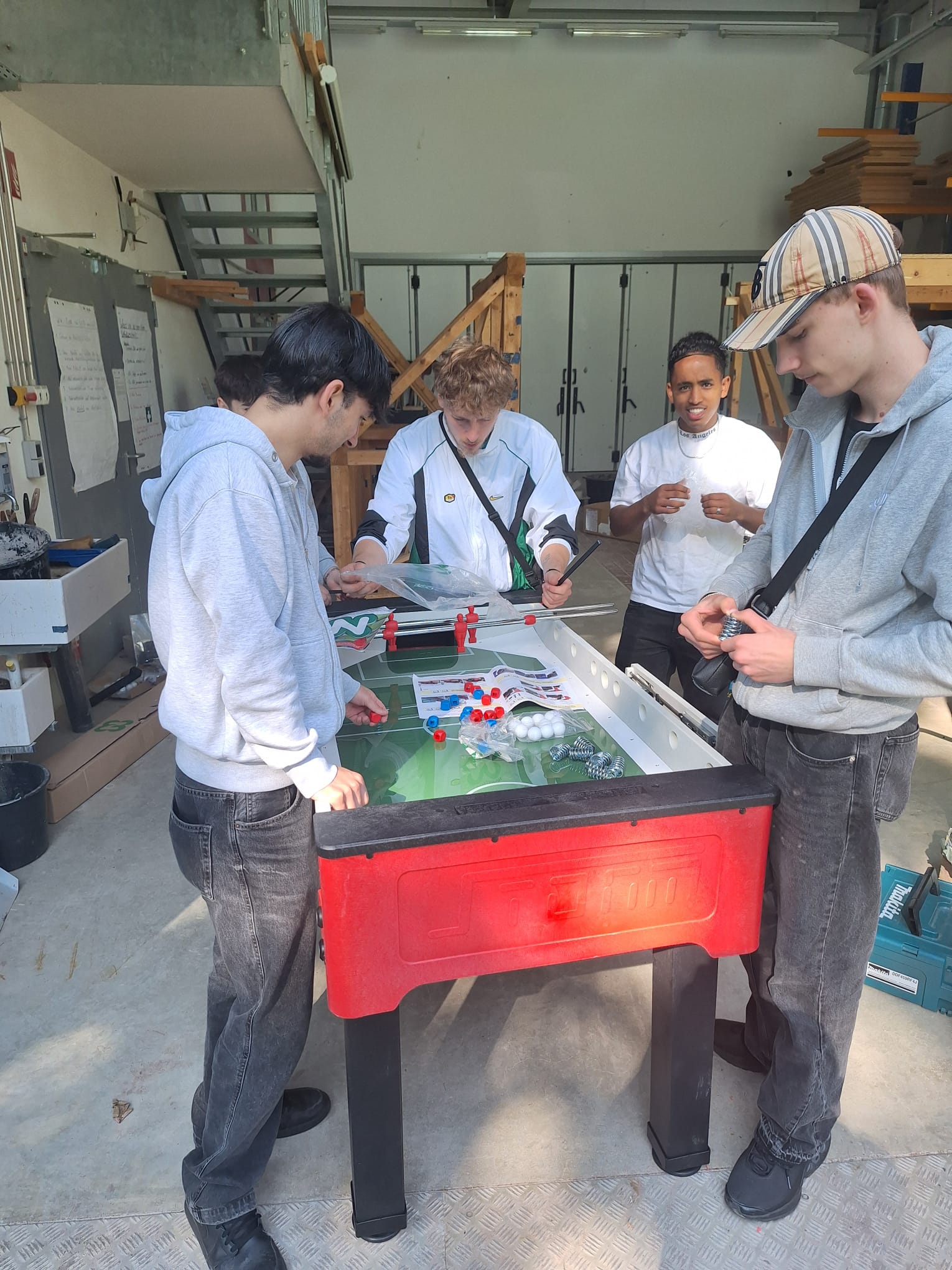 Der Kickertisch war das kompliziertere Spielgerät, zumindest was den Aufbau betraf. Doch eine Klasse aus dem Fachbereich Möbel-, Küchen- und Umzugsservice, „echte Macher“, nahmen sich die Aufbauanleitung zur Hand und setzten das Projekt an einem Vormittag um. Nach dem Zusammenbau wurde natürlich noch ein klasseninternes Kickerturnier gespielt. „Der Kickertisch ist auf jeden Fall bespielbar“, so einer der Schüler, nachdem er das Turnier gewonnen hatte.