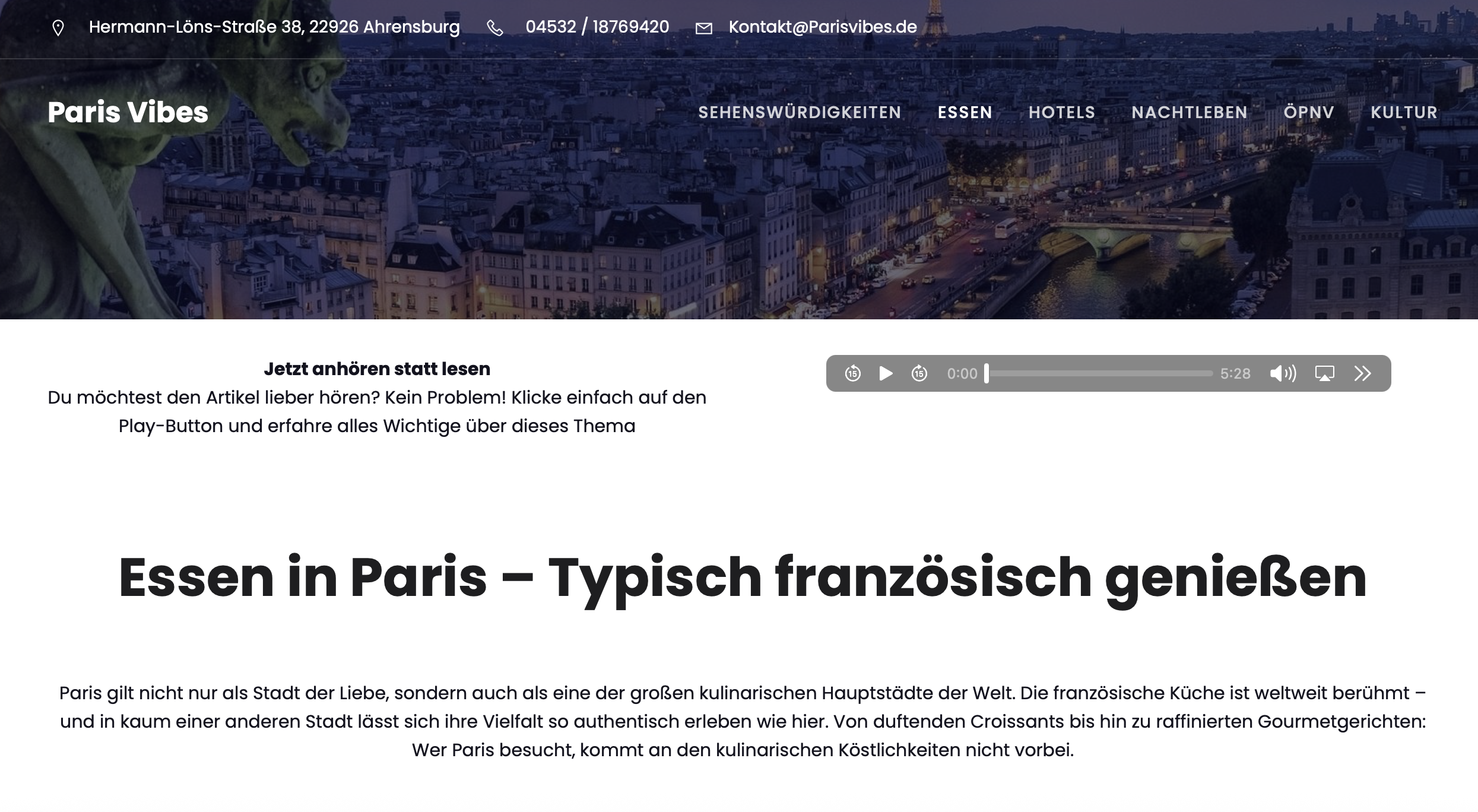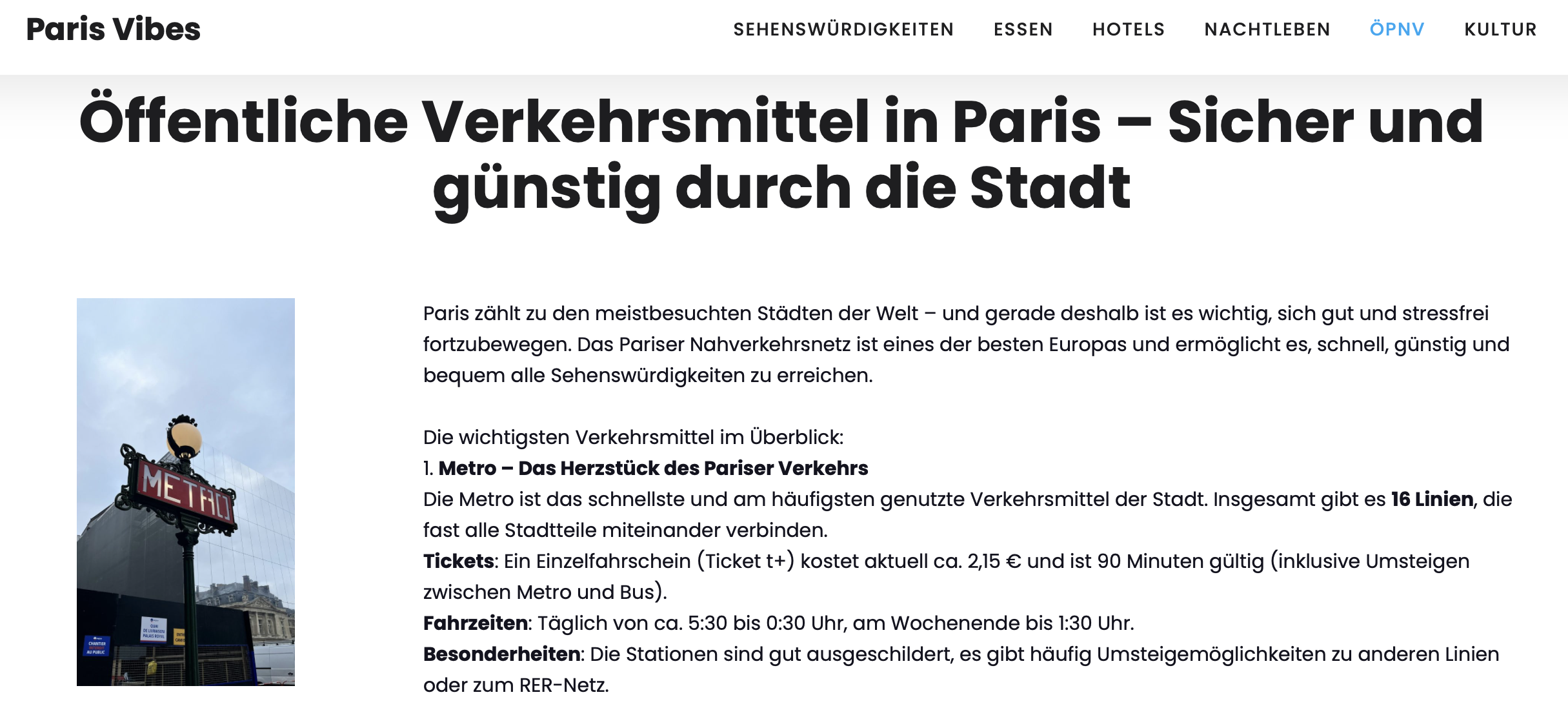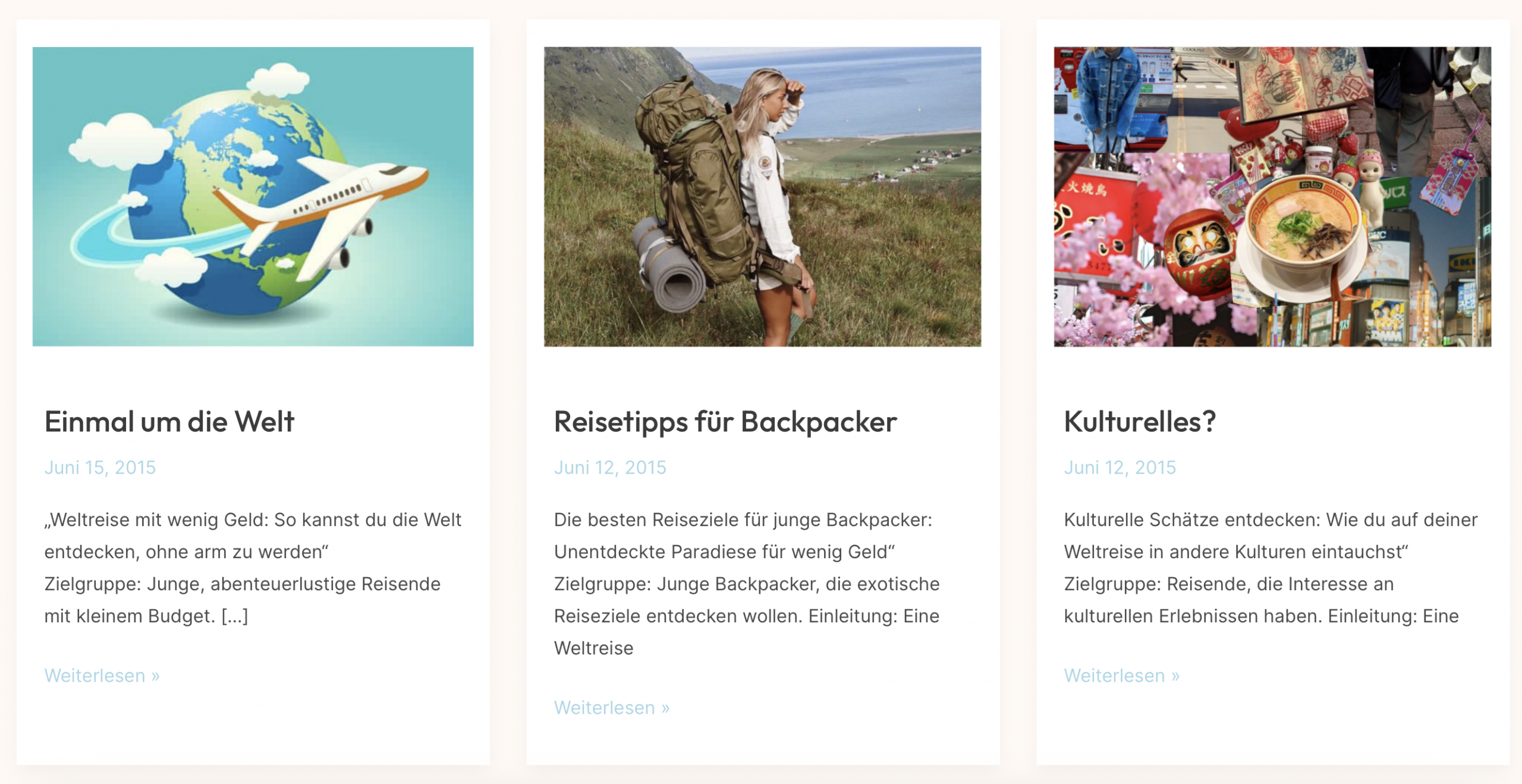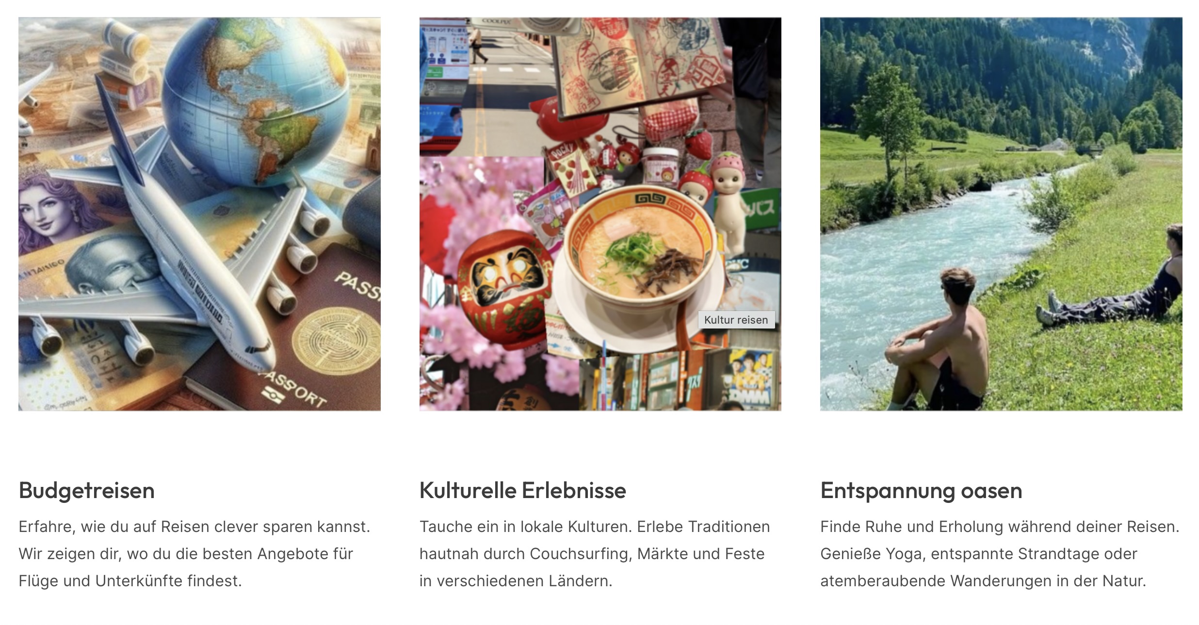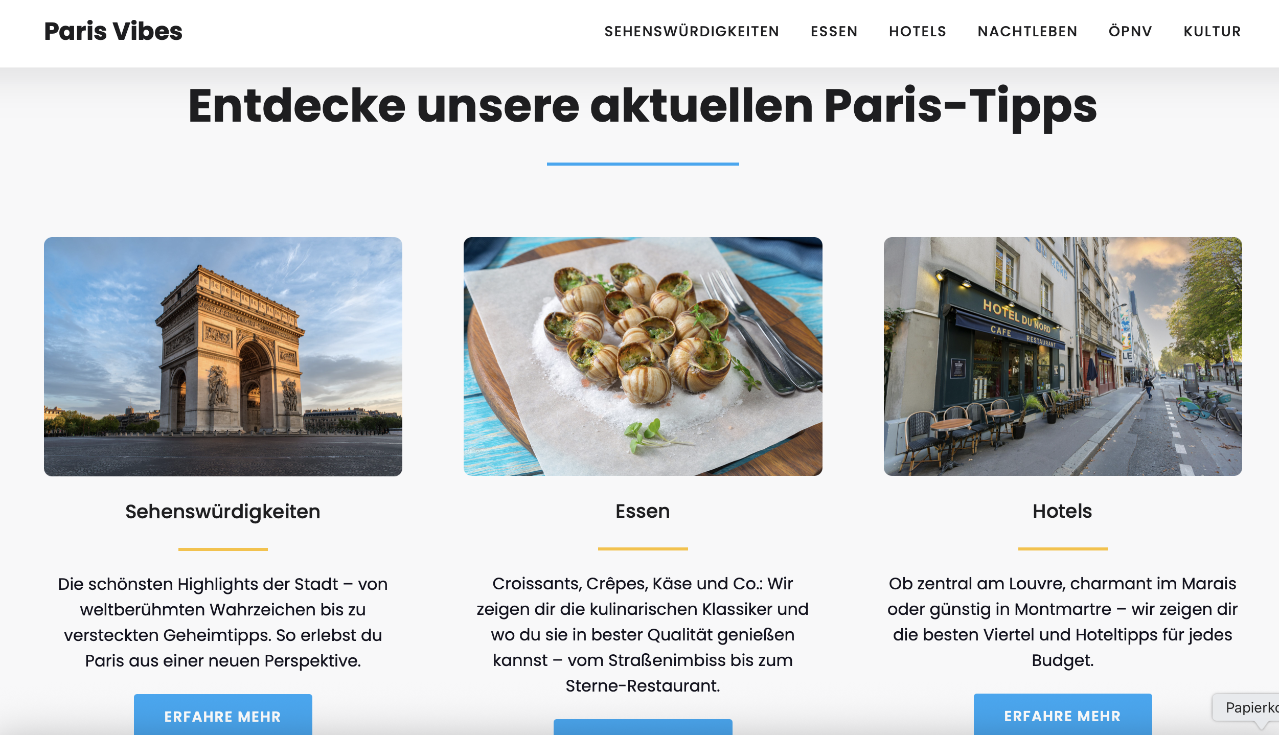 Um das alles nicht nur theoretisch zu lernen, haben wir im Unterricht eigene Webseiten in Form eines Blogs gebaut. In drei Gruppen erstellten wir Seiten zu verschiedenen Themen: zweimal Travel und einmal Food. Jede Gruppe übernahm dabei alle Aufgaben selbst – vom Konzept über das Design bis hin zur Umsetzung und SEO-Optimierung.